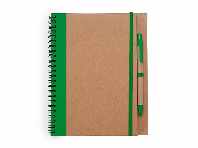 Блокнот на спирали с жесткой обложкой из переработанного картона. Включает шариковую ручку с синими чернилами. 60 простых листов. |