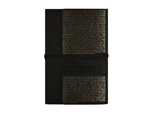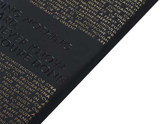 Так трудно ничего не делать, ведь совершенно непонятно, когда ты закончишь! Лаконичный слоган мотивирует к активным действиям. Планируй и завершай! Вот что кроется в элегантной надписи, выполненной золотым тиснением! А Flex обложка напоминает Будь гибким! Великолепный недатированный ежедневник Bilbao черно-синего цвета с тиснением фольгой. Бежевая бумага 65 г/м, широкая горизонтальная фиксирующая резинка. Гибкая обложка с покрытием Soft-touch. Особенность этого ежедневника - часть обложки внахлест может использоваться как закладка. Ежедневник упакован в картонный полукороб и термопленку. |