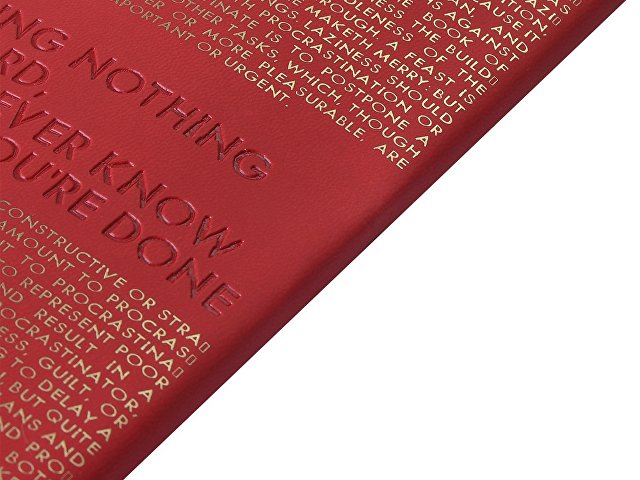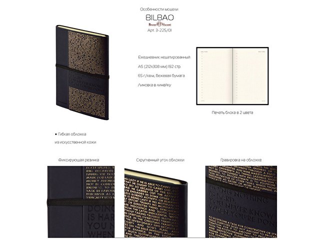 Так трудно ничего не делать, ведь совершенно непонятно, когда ты закончишь! Лаконичный слоган мотивирует к активным действиям. Планируй и завершай! Вот что кроется в элегантной надписи, выполненной золотым тиснением! А Flex обложка напоминает Будь гибким! Великолепный недатированный ежедневник Bilbao черно-синего цвета с тиснением фольгой. Бежевая бумага 65 г/м, широкая горизонтальная фиксирующая резинка. Гибкая обложка с покрытием Soft-touch. Особенность этого ежедневника - часть обложки внахлест может использоваться как закладка. Ежедневник упакован в картонный полукороб и термопленку. |