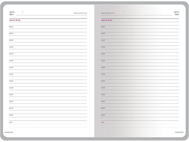 В ежедневнике Sidney Nebraska есть полезная справочная информация и телефонная книга на 18 листов, а также 272 страницы для записи идей, мыслей и составления рабочих планов. Для изготовления страниц используется качественный бежевый офсет повышенной плотности (70 г/кв м), который производится в Японии и подходит для всех видов чернил. Разметка блока с указанием времени позволяет планировать дела с точностью до 1 часа.