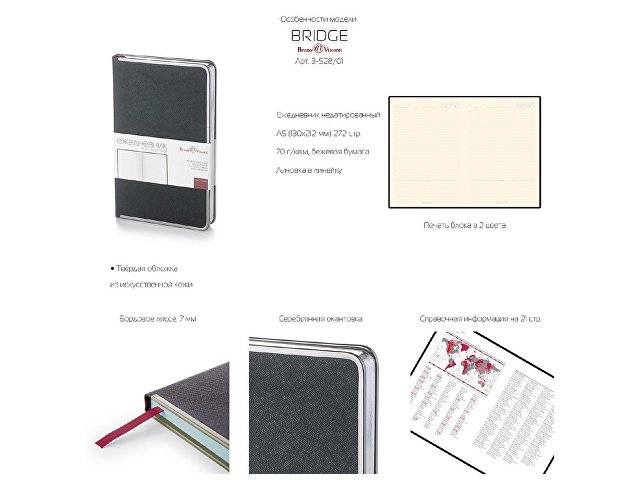 В ежедневнике Bridge есть полезная справочная информация на русском языке, а также 272 страницы для записи идей, мыслей и составления рабочих планов. День недели указан на английском языке. Для изготовления страниц используется качественный офсет, тонированного в кремовый цвет (70 г/кв м), который производится в Японии и подходит для всех видов чернил.