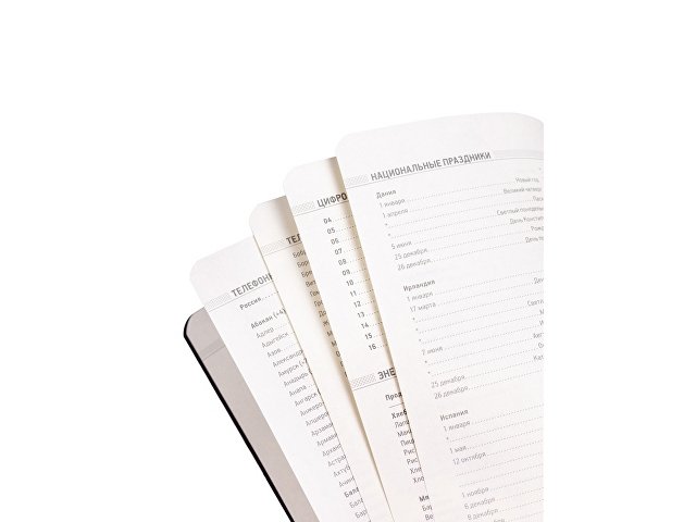 В ежедневнике Megapolis Flex есть полезная справочная информация и телефонная книга, а также страницы для записи идей, мыслей и составления рабочих планов. Для изготовления страниц используется качественный бежевый офсет повышенной плотности (70 г/кв м). Блок не привязан к конкретным датам – они указываются в выделенном поле вверху страницы. Тонированная бумага не дает глазам утомиться даже при длительной работе.