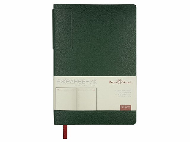 Лаконичная модель в ярком исполнении: гибкая обложка темно-зеленого цвета с контрастной или в цвет обложки нашивкой. Выполнен из качественной и прочной искусственной кожи, крепление внутреннего блока - книжный переплет, закладка- ляссе. Углы обложки скруглены.