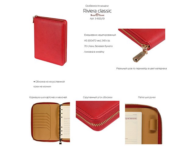 Великолепный ежедневник из качественной искусственной кожи, который заменит вам портмоне и органайзер. В ежедневнике предусмотрены карманы для карточек, сменный блок на кольцах. Внутри достаточно места для ручки и даже для мобильного телефона. Сам ежедневник закрывается на молнию. Его удобно брать с собой и на переговоры, и на деловой обед. Блок отпечатан в 2 цвета на бежевой бумаге плотностью 70 г/м2. |