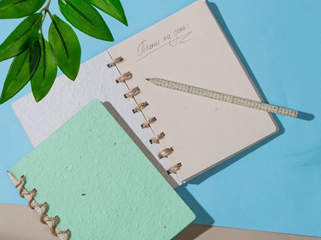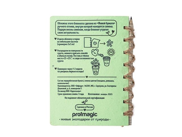 Живой Блокнот - это блокнот ручной работы с семенами гвоздики, ромашки и колокольчика внутри обложки. Блок на 50 листов сделан из экологичной неотбеленной бумаги, вместо пружины используется льняной шпагат. Блокнот поставляется с бумажным карандашом в наборе. После использования блокнота, вырвите обложку, порвите ее на кусочки и посадите в землю. Поливайте и уже через несколько недель вы увидите первые всходы. |