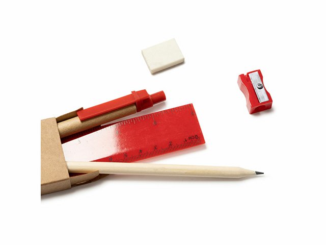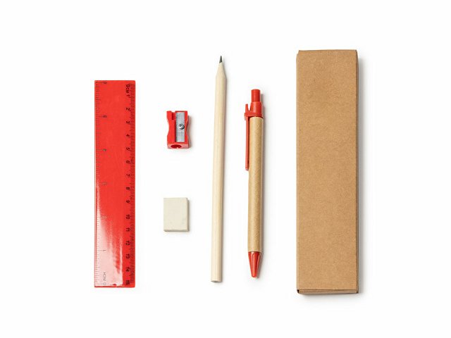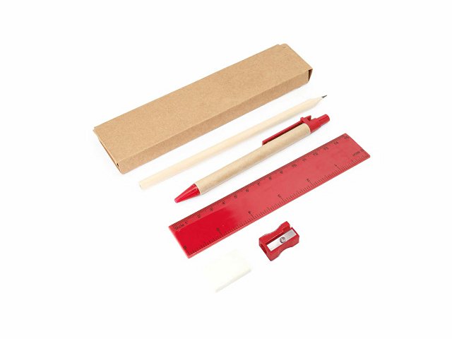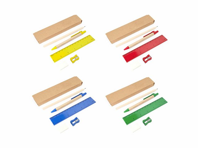 Канцелярский набор. Включает ручку с картонным корпусом и синими чернилами, деревянный карандаш, точилку для карандашей, ластик и линейку длиной 15 см. |