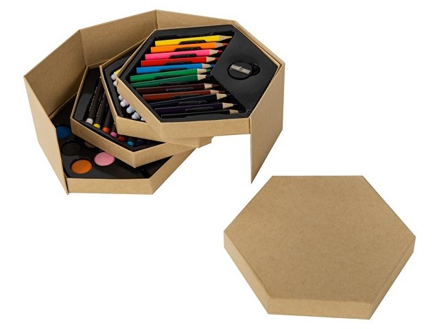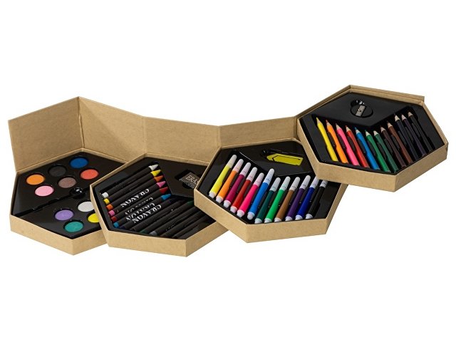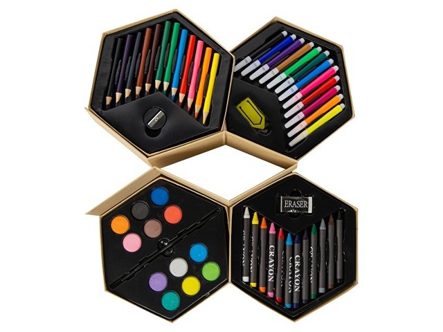 Набор из 52 предметов для рисования. 12 маркеров, 12 цветных карандашей, 12 восковых карандашей, 12 акварельных красок, кисточка, точилка, резинка и большая скрепка. |