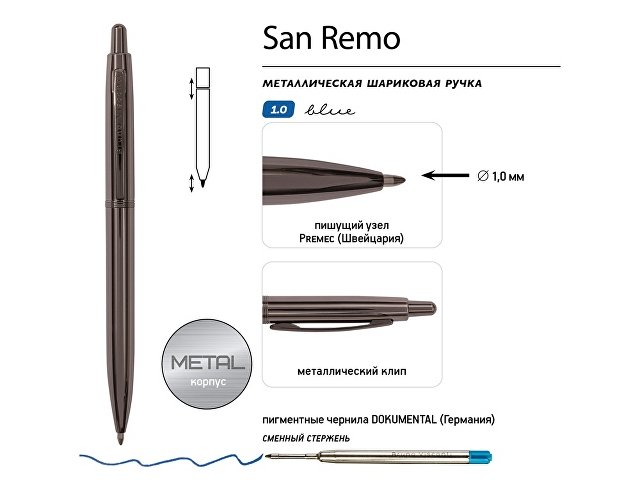 Металлическая шариковая ручка San Remo - аксессуар, призванный стать настоящим элементом стиля, подчеркнуть индивидуальность его владельца.