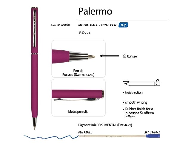 Автоматическая металлическая ручка Bruno Visconti серии Palermo однотонного цвета порадует любителей всего изящного и утонченного. Покрытие корпуса Soft Touch гарантирует дополнительный комфорт в работе с ней. Стержень легко выдвигается благодаря поворотному механизму. Синие пигментные чернила Dokumental (Германия) и пишущий узел Premec (Швейцария) обеспечивают качественное и мягкое письмо. |
