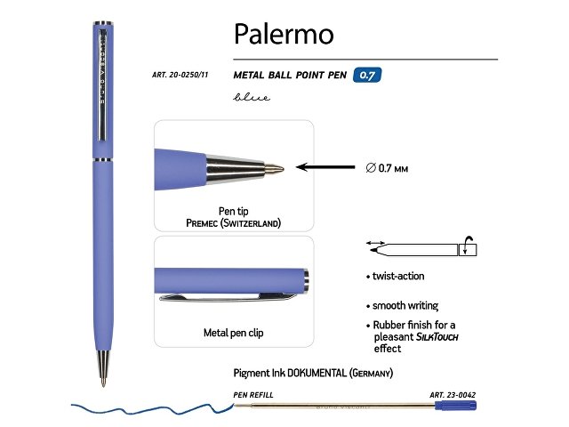 Автоматическая металлическая ручка Bruno Visconti серии Palermo однотонного цвета порадует любителей всего изящного и утонченного. Покрытие корпуса Soft Touch гарантирует дополнительный комфорт в работе с ней. Стержень легко выдвигается благодаря поворотному механизму. Синие пигментные чернила Dokumental (Германия) и пишущий узел Premec (Швейцария) обеспечивают качественное и мягкое письмо. |