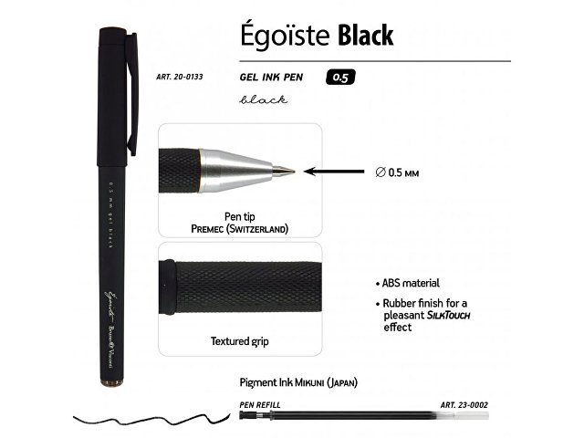 Гелевые ручки Egoiste представлены в удобных для захвата округлых корпусах. Повышенную эргономичность обеспечивает приятное на ощупь прорезиненное покрытие Silk Touch. Рельефная текстура надписи с логотипом не дает пальцам скользить. Корпус черного цвета дополнен защитным колпачком с упругим клипом.