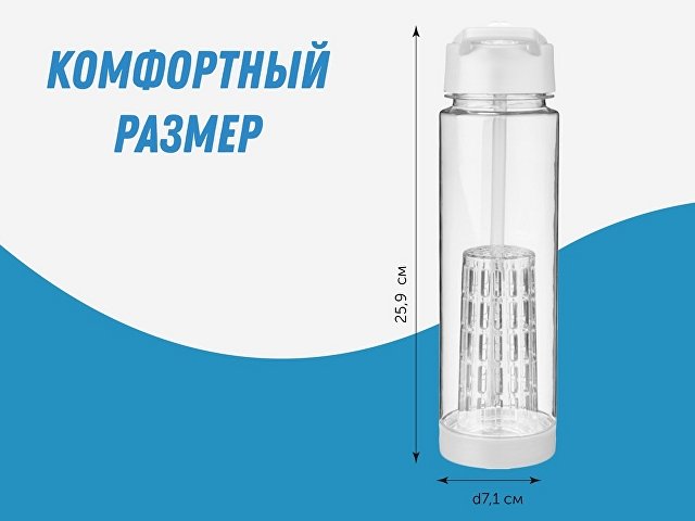 Оригинальная бутылка для воды. Благодаря отделению для фруктов есть возможность создания лимонада на свой вкус. Придется по вкусу любителям натуральных продуктов и здорового образа жизни. Легко разбирается. На пластиковый корпус возможно нанесение тампопечати. Объем – 740 мл. |