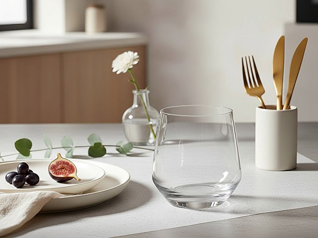 Стеклянный бокал необычной формы — вариант, чтобы разнообразить домашний мини-бар. Подходит не только для крепких напитков, но и для воды, коктейлей и соков.