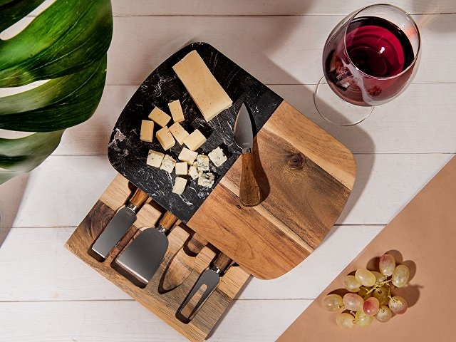 Этот роскошный набор для сыра идеально подходит на роль подарка для любого торжественного случая. Набор изготовлен из черного мрамора и акации: каменная вставка на крышке выполняет не только декоративную, но и практическую функцию, ведь на ней очень удобно резать и раскладывать сыр. Инструменты для резки сыра хранятся в выдвижном ящике под крышкой, для каждого из приспособлений предусмотрена своя вырубленная ниша. Из-за особенностей материала возможны вариации рисунка мрамора и дерева, что может отразиться на выгравированном изображении. |