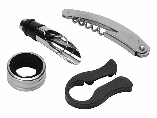 Набор винных аксессуаров состоит из воронки-аэратора, штопора, каплеуловителя и ножа для срезания фольги. Металлические детали выполнены из нержавеющей стали, устойчивой к коррозии, также использованы силиконовая резина и АБС-пластик, абсолютно безопасный для человека.