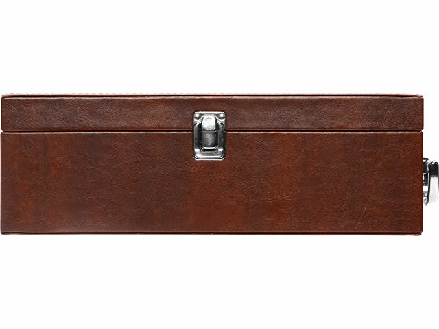Самое главное — это футляр, в котором находится набор: принадлежности расположились в вырубленных нишах на крышке, а большое основное отделение предназначено для бутылки вина.