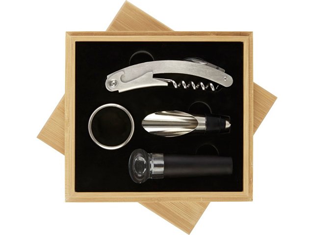 Описание: Набор для вина из 4 предметов: штопор, пробка, насадка на бутылку и кольцо. Поставляется в бамбуковой подарочной коробке, изготовленной в соответствии с экологическими стандартами.