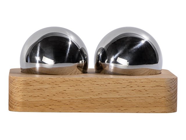 Набор состоит из двух сфер, выполненных из нержавеющей стали, и подставки из дерева, которая позволяет хранить их надлежащим образом и не дает укатываться с полки.