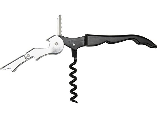 Нож официанта из нержавеющей стали с цветным корпусом со штопором, обрезчиком для фольги и открывалкой для бутылок. Благодаря двухступенчатой конструкции с его помощью вытащить пробку из бутылки не составит труда. |