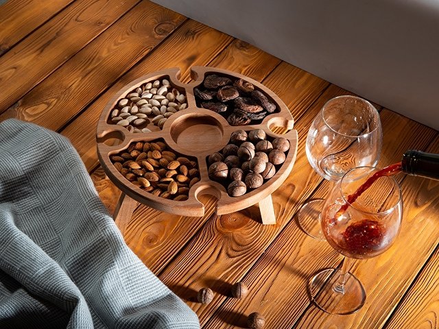 Деревянный столик на складных ножках может быть использован как во время пикников на открытом воздухе, так и дома, где его можно использовать прямо на полу. Столик позволяет подать 4 вида различных закусок, не смешивая их, благодаря четырем сепарированным секциям, в которые можно поместить ягоды, орехи и другие снеки, желательно, сухие либо подающиеся в масле (оливки, маслины). Четыре держателя для бокала особенно актуальны во время отдыха на природе, где каждый участник пикника обязательно оценит возможность зафиксировать посуду для вина.