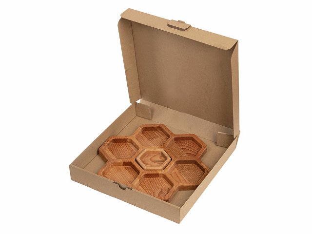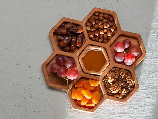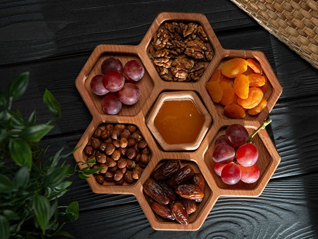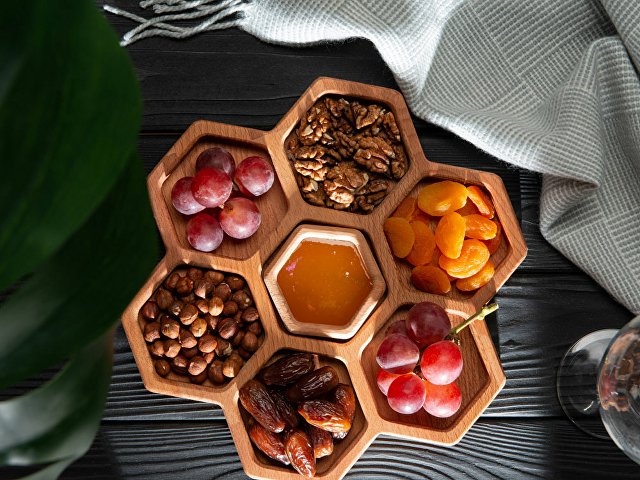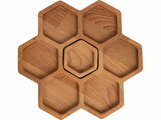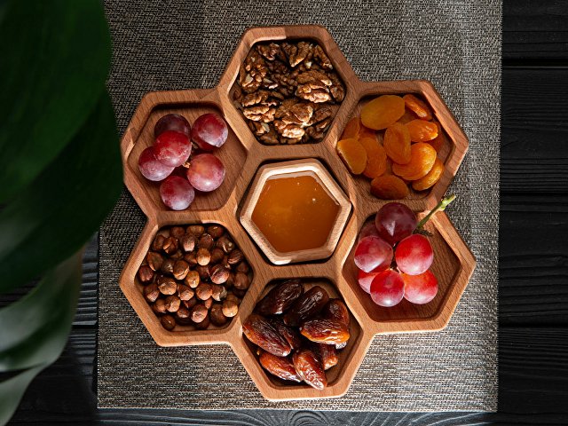 Менажница выполнена в виде семи сот для разных видов закусок — за бонусную дополнительную отвечает съемная сота-соусница, в которую можно залить мед или любимый соус.