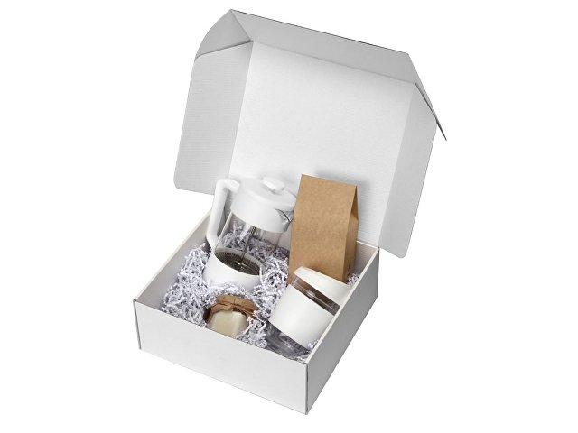 френч-пресс- прозрачный, белый, стеклянный стакан- прозрачный, белый, упаковка кофе- крафт, бумажный наполнитель- серый |