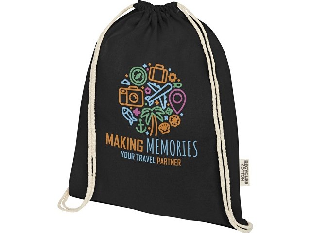 Сумку Oregon на шнурке, изготовленную из 100% переработанного хлопка, сертифицированного GRS, легко преподнести в качестве подарка для продвижения вашего бренда или маркетинговой кампании. Эта легкая сумка недорога, ее легко носить на спине или на плече, и в ней достаточно места для размещения логотипа или других надписей. Шнурок позволяет легко открывать и закрывать сумку, а хлопковый материал плотностью 140 г/м? прочный и долговечный. Большое основное отделение затягивается хлопковым шнурком. Выдерживает вес до 5 кг. GRS certified recycled cotton, 140 g/m2. |