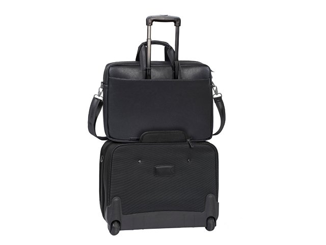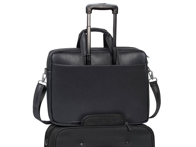 • На задней панели имеется карман на молнии для крепления сумки к ручке чемодана.