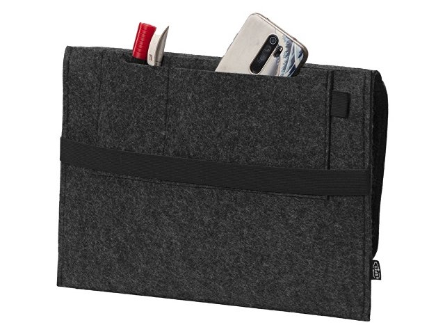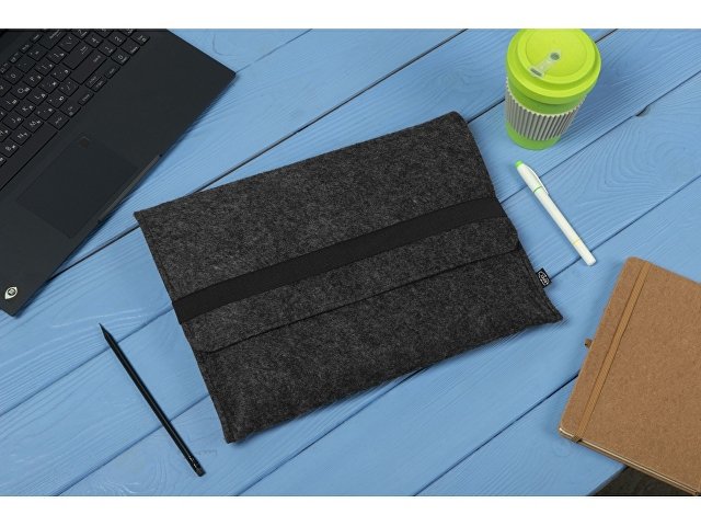 Чехол для ноутбука выполнен из фетра толщиной 3 мм. С передней стороны расположен органайзер размером 13x27 см для канцелярских принадлежностей, карт и телефона. Чехол фиксируется в закрытом виде с помощью эластичной ленты. |