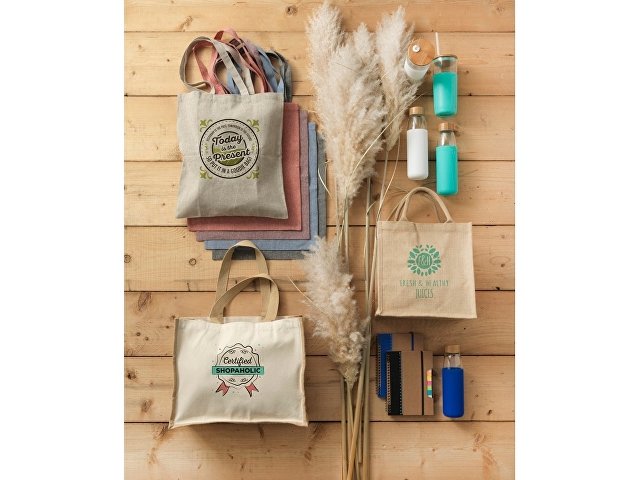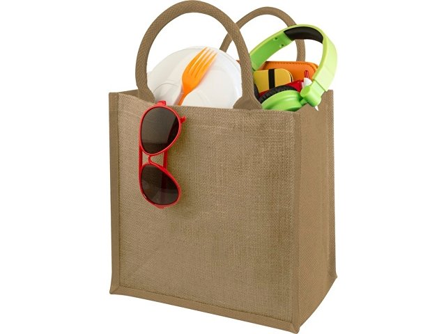 Джутовая подарочная сумка Chennai. Джутовая сумка с ламинированным открытым основным отделением и вставкой. Хлопковые ручки высотой 11,5 см. Джут. |