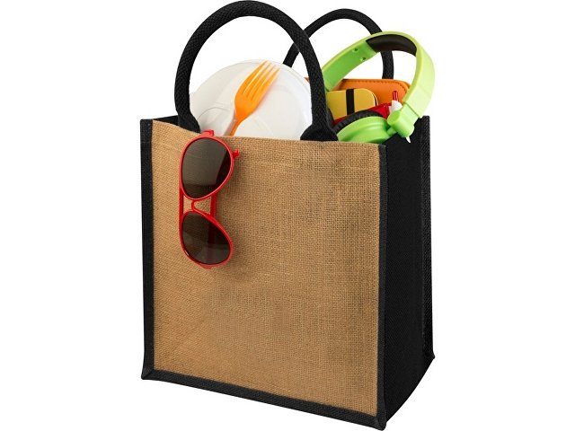Джутовая подарочная сумка с ламинированным открытым основным отделением, которое застегивается на липучку. Хлопковые ручки высотой 11,5 см. |