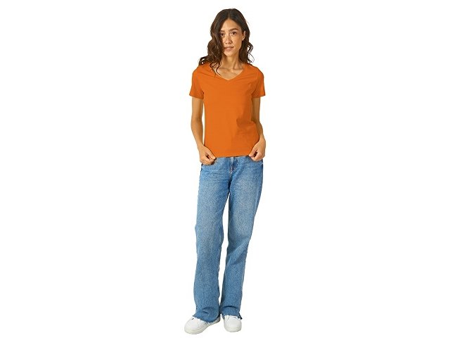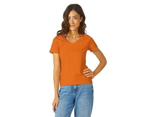 Женская футболка из натурального хлопка с элегантным V-образным вырезом. Материал отлично подходит для нанесения рекламной информации. Натуральная ткань не вызывает раздражения кожи. |