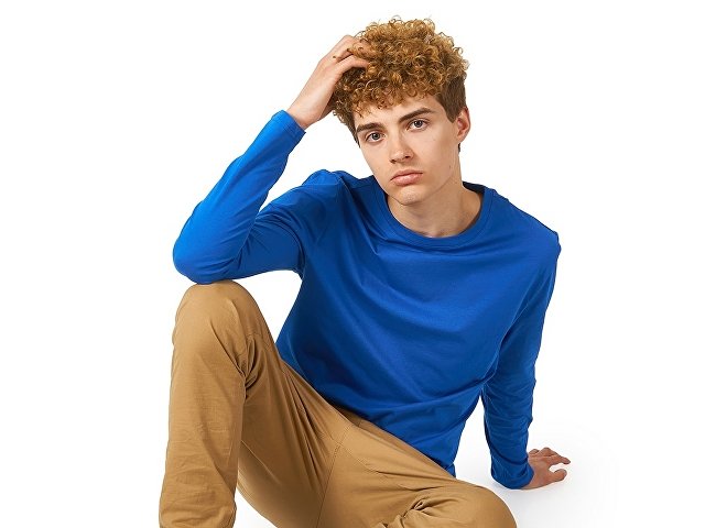 Футболка с длинным рукавом комфортной посадки с боковыми швами. Горловина обработана рибом 1х1 и тесьмой по спинке. Футболка выполнена из хлопкового джерси. |