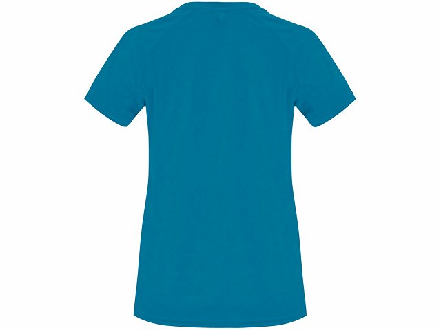 Спортивная футболка с коротким рукавом реглан для женщин. Круглый вырез горловины с отделкой плоским швом. Рукав сложного кроя для обеспечения дополнительного удобства при занятиях спортом. Отделка плоским швом с застилом по пройме и рукавам.