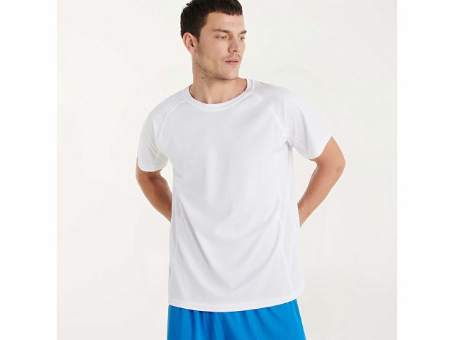 Спортивная мужская футболка с коротким рукавом реглан. Круглый вырез горловины и боковая вставка с отстрочкой плоским швом.