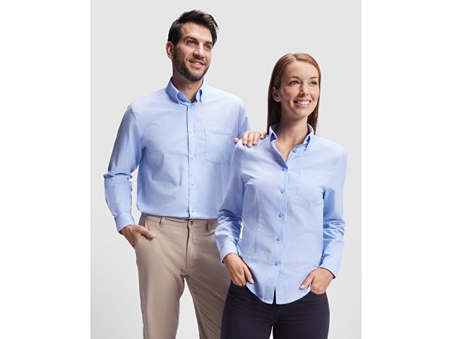 Женская рубашка с длинным рукавом, накладной карман слева. Планка на пуговицах. Отложной воротник на стойке, могут встречаться изделия, где воротник продублирован пуговицами. Манжета регулируется по ширине с помощью 2-х пуговиц. Кокетка на спинке. |