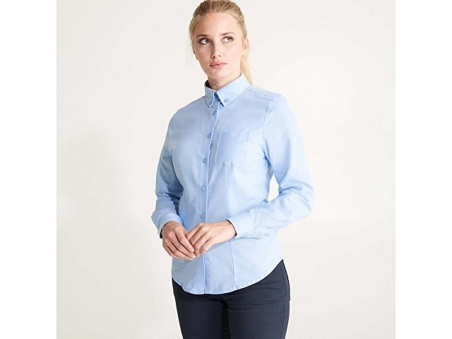 Женская рубашка с длинным рукавом, накладной карман слева. Планка на пуговицах. Отложной воротник на стойке, могут встречаться изделия, где воротник продублирован пуговицами. Манжета регулируется по ширине с помощью 2-х пуговиц. Кокетка на спинке. |