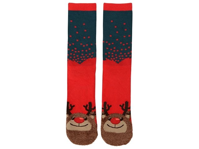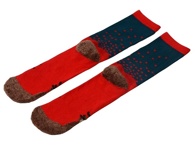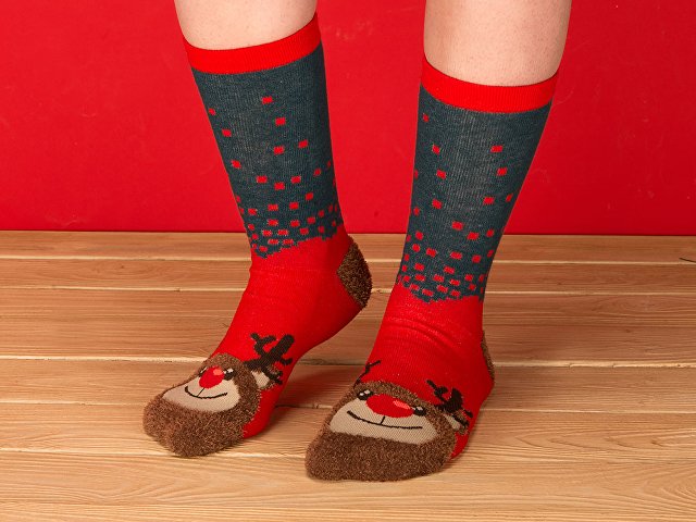 Рождественские носки прекрасно подойдут на роль подарка, который создает праздничное настроение. Этот набор состоит из двух пар, которые упакованы в мешочек из натурального хлопка. Одна пара украшена мягкими пушистыми мордочками рождественских оленей, а принт на второй изображает сапожки Санта Клауса. Ткань -- смесь хлопка, полиэстера и спандекса, что обеспечивает носкам износостойкость, а мягкая широкая резинка – удобную посадку по ноге. Мешочек-упаковку можно брендировать по вашему желанию.