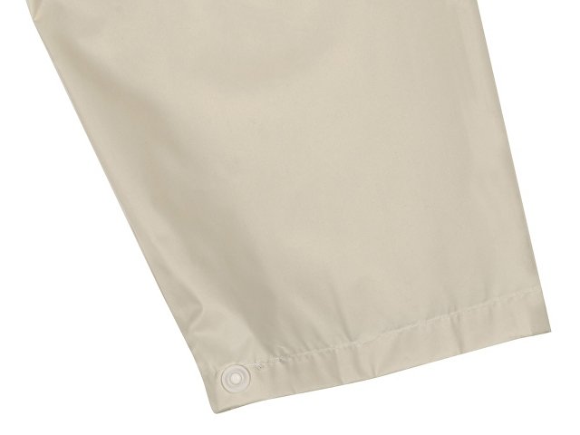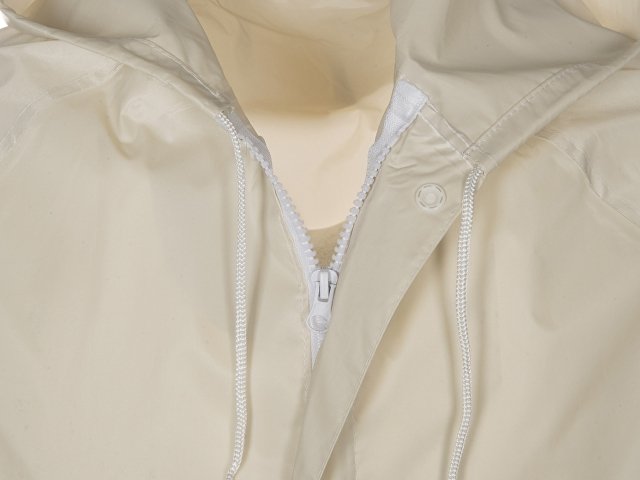 Длинный дождевик выполнен из полиэстера с водоотталкивающей пропиткой. Застегивается на молнию, поверх которой — планка на кнопках, что дополнительно защищает от ветра и промокания. Посадку капюшона можно регулировать при помощи шнурка, ширина рукава регулируется кнопкой.