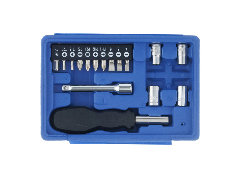 Набор инструментов на 25 предметов STINGER W0414 поставляется в необычном трёхстворчатом пластиковом кейсе насыщенного синего цвета. Входящие в комплект инструменты позволят без труда решать самые разные задачи по ремонту в доме или починке техники. Все инструменты изготовлены из высококачественной закаленной углеродистой стали с хромированным покрытием, рукоятки выполнены из углепластика чёрного цвета. Этот материал не скользит и гарантирует удобное положение в руке.
