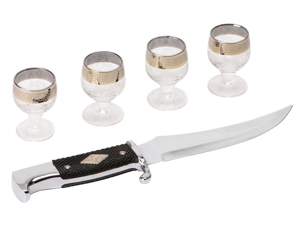 футляр- искусственная кожа, стопки- стекло, нож- дерево/нержавеющая сталь |