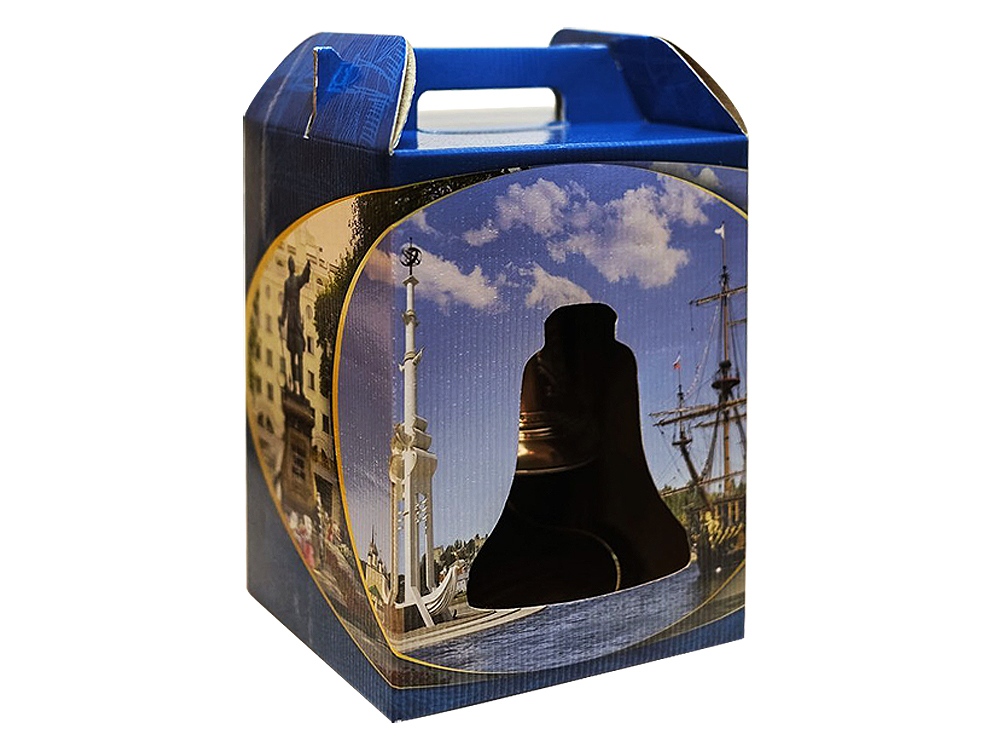 Колокол сувенирный весом 1кг Всея Руси на дубовой подставке. Поверхность колокола черненая с вызолочением.