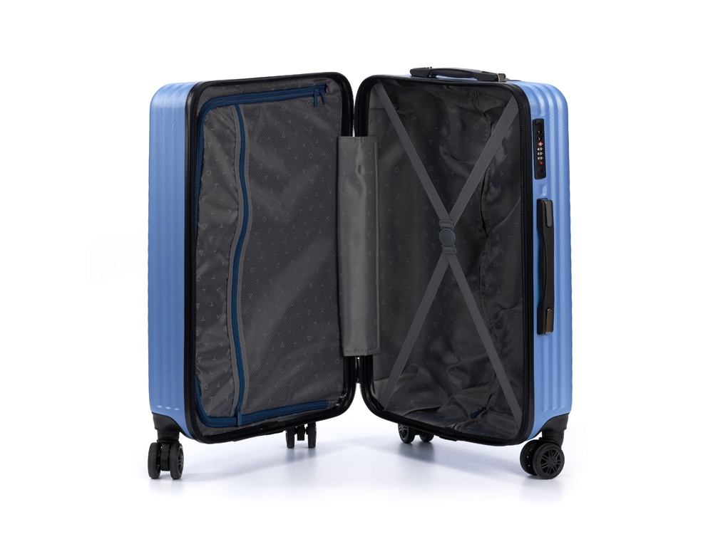 Чемодан полностью раскрывается на 2 вместительных отделения, с перегородкой на молнии и ремнями в форме X для надежной фиксации вещей на месте.