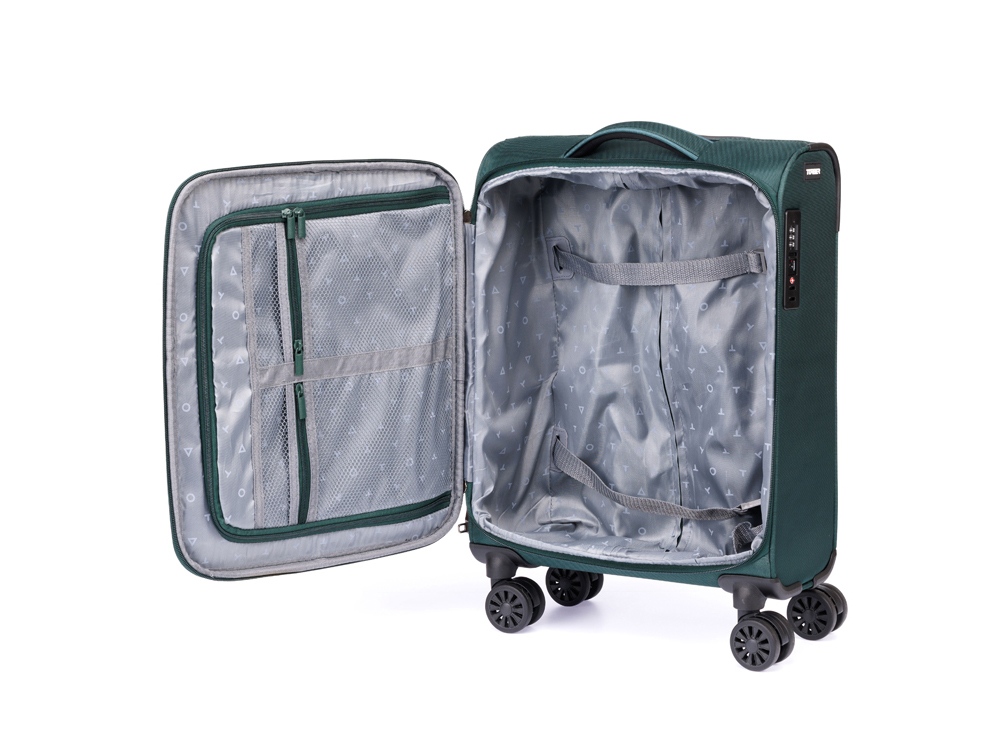 Чемодан полностью раскрывается на 2 отделения, с перегородкой на молнии и ремнями для надежной фиксации вещей на месте.