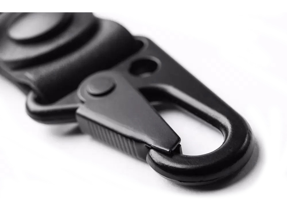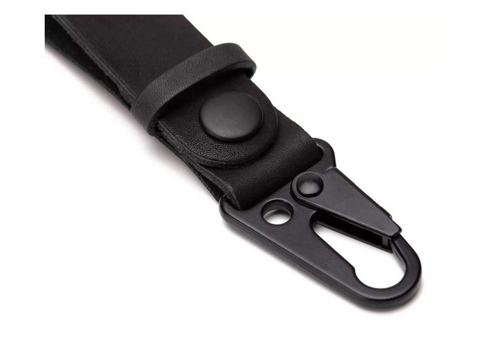 Ремешок сшит из прочной кожи чёрного цвета. Оборудован надёжным металлическим карабином, самопроизвольное расцепление которого невозможно. Ключи, прицепленные к нему, обречены вечно храниться в глубинах сумки или кармана джинсов, и у них нет ни единого шанса потеряться. Прицепить ремешок можно к шлёвке джинсов или к куртке. |