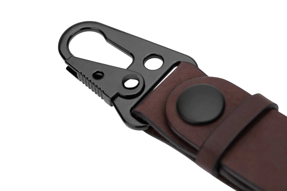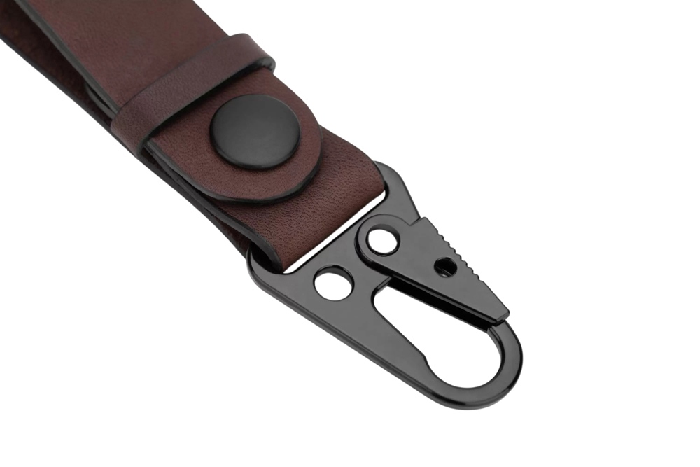 Ремешок сшит из прочной кожи коричневого цвета. Оборудован надёжным металлическим карабином, самопроизвольное расцепление которого невозможно. Ключи, прицепленные к нему, обречены вечно храниться в глубинах сумки или кармана джинсов, и у них нет ни единого шанса потеряться. Прицепить ремешок можно к шлёвке джинсов или к куртке. |