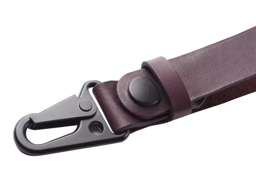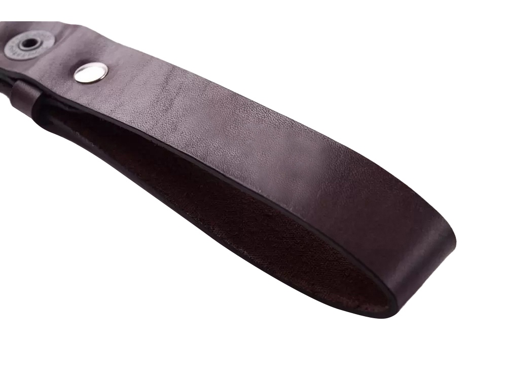Ремешок сшит из прочной кожи коричневого цвета. Оборудован надёжным металлическим карабином, самопроизвольное расцепление которого невозможно. Ключи, прицепленные к нему, обречены вечно храниться в глубинах сумки или кармана джинсов, и у них нет ни единого шанса потеряться. Прицепить ремешок можно к шлёвке джинсов или к куртке. |
