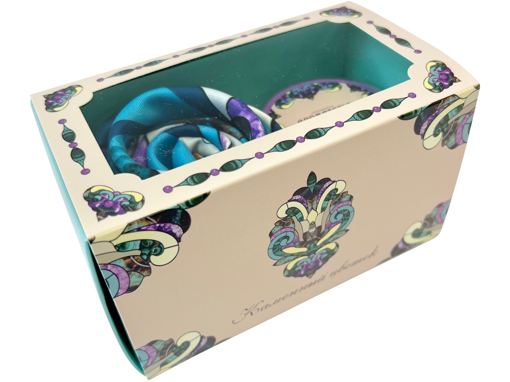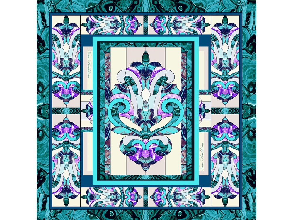 Платок Каменный цветок открывает сокровищницу садов Хозяйки Медной горы. Заглавный образ навеян сказом о Каменном Цветке – символе творческого поиска и совершенства. Мозаика цветка содержит уральские самоцветные кристаллы аметиста и медного изумруда в обрамлении каймы узорчатого малахита.