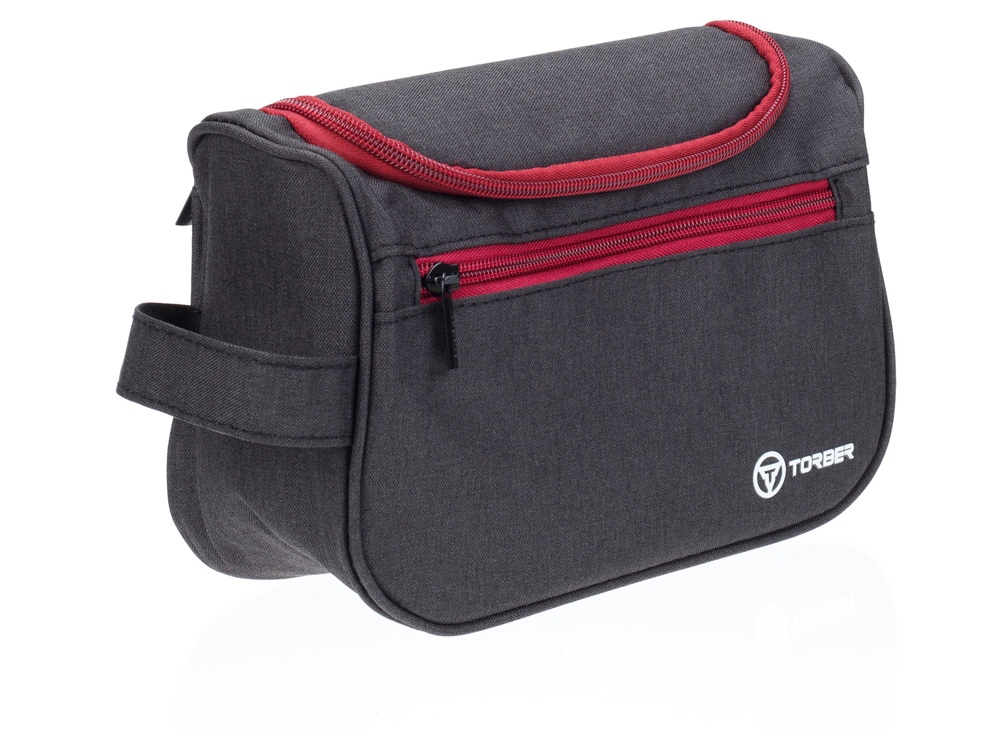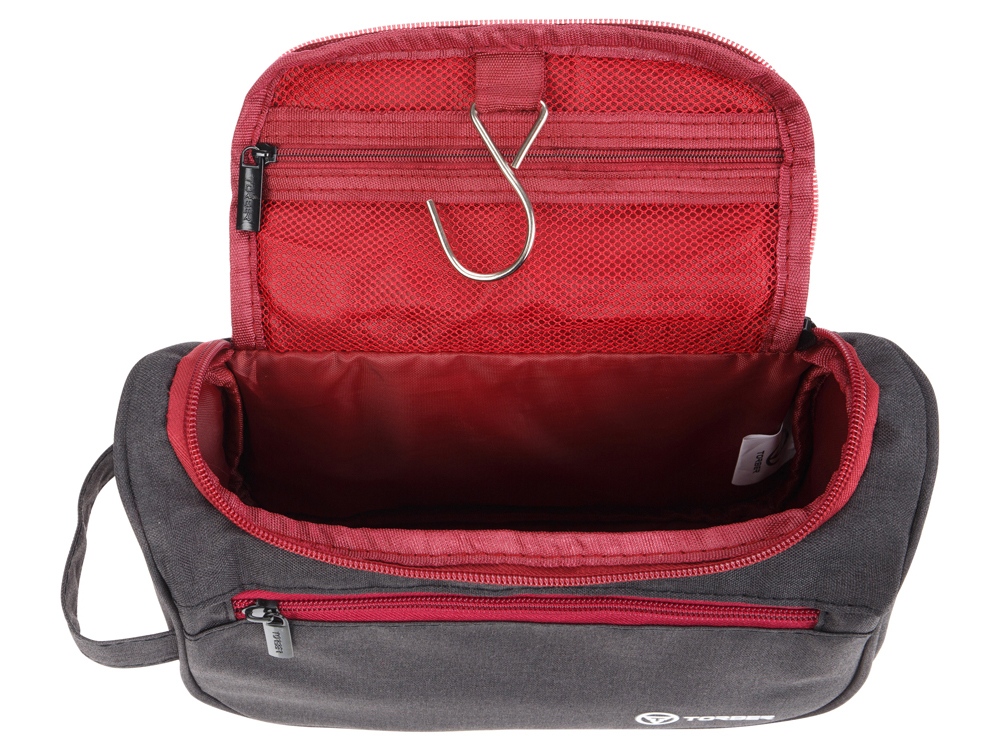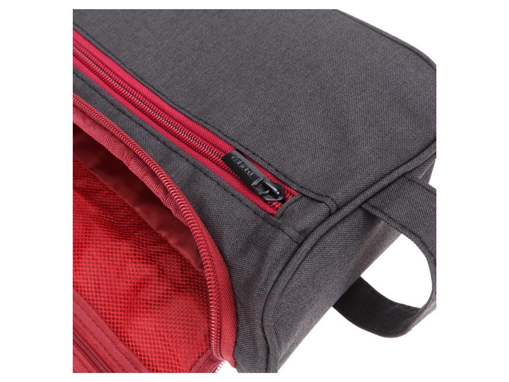 Несессер выполнен из чёрного полиэстера c внешней отделкой и внутренней тканью бордового цвета. В нём можно хранить или транспортировать личные вещи и гаджеты.