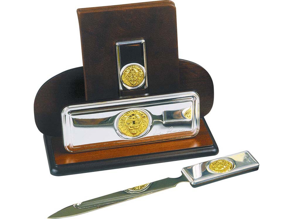 Luigi Pesaresi – один из ведущих итальянских дизайнеров, все изделия которого выполнены с безупречным вкусом. Настольный набор и аксессуары сделаны из ценных пород дерева, кожи теленка и серебра. На каждой серебряной накладке факсимильная подпись основателя бренда. Набор выглядит не просто презентабельно, он выглядит величественно. |